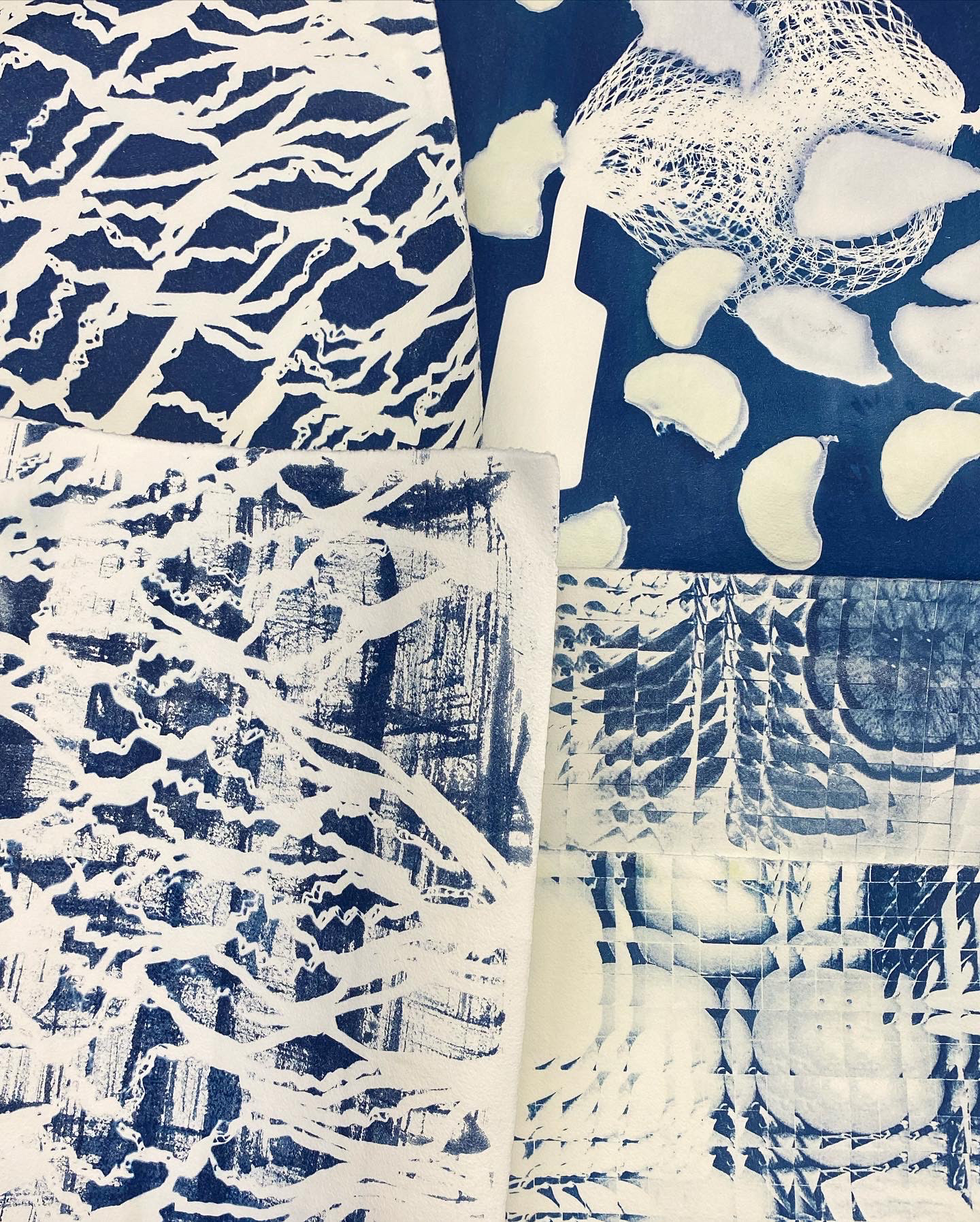 Sinds dit jaar heb ik cyanotype helemaal ontdekt, ik had al een diy kit thuis liggen die ik ooit als cadeau heb gekregen, maar daar heb ik heel lang niks mee gedaan. Toen ik het toch wilde uitproberen thuis bleek er niet genoeg zon te zijn om het werk goed te belichten, want verder had ik geen uv lamp thuis. Dus toen ben ik op school maar de doka in gedoken en dat bleek ook nog eens een stuk minder onhandig te gaan. Toen ik door had hoe makkelijk een afdruk maken was ben ik verschillende keren gaan experimenteren met verschillende materialen.