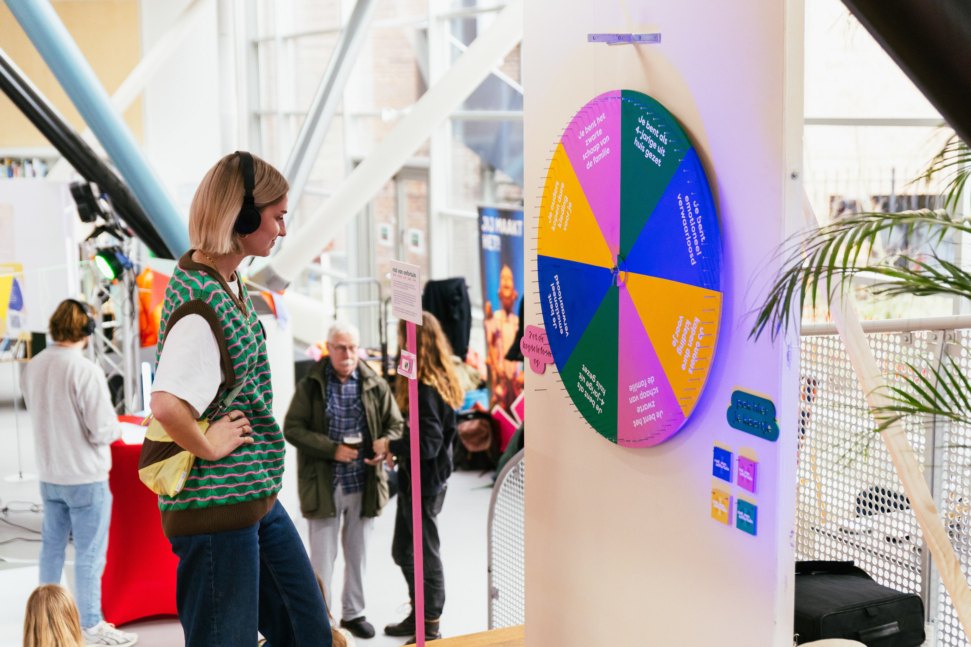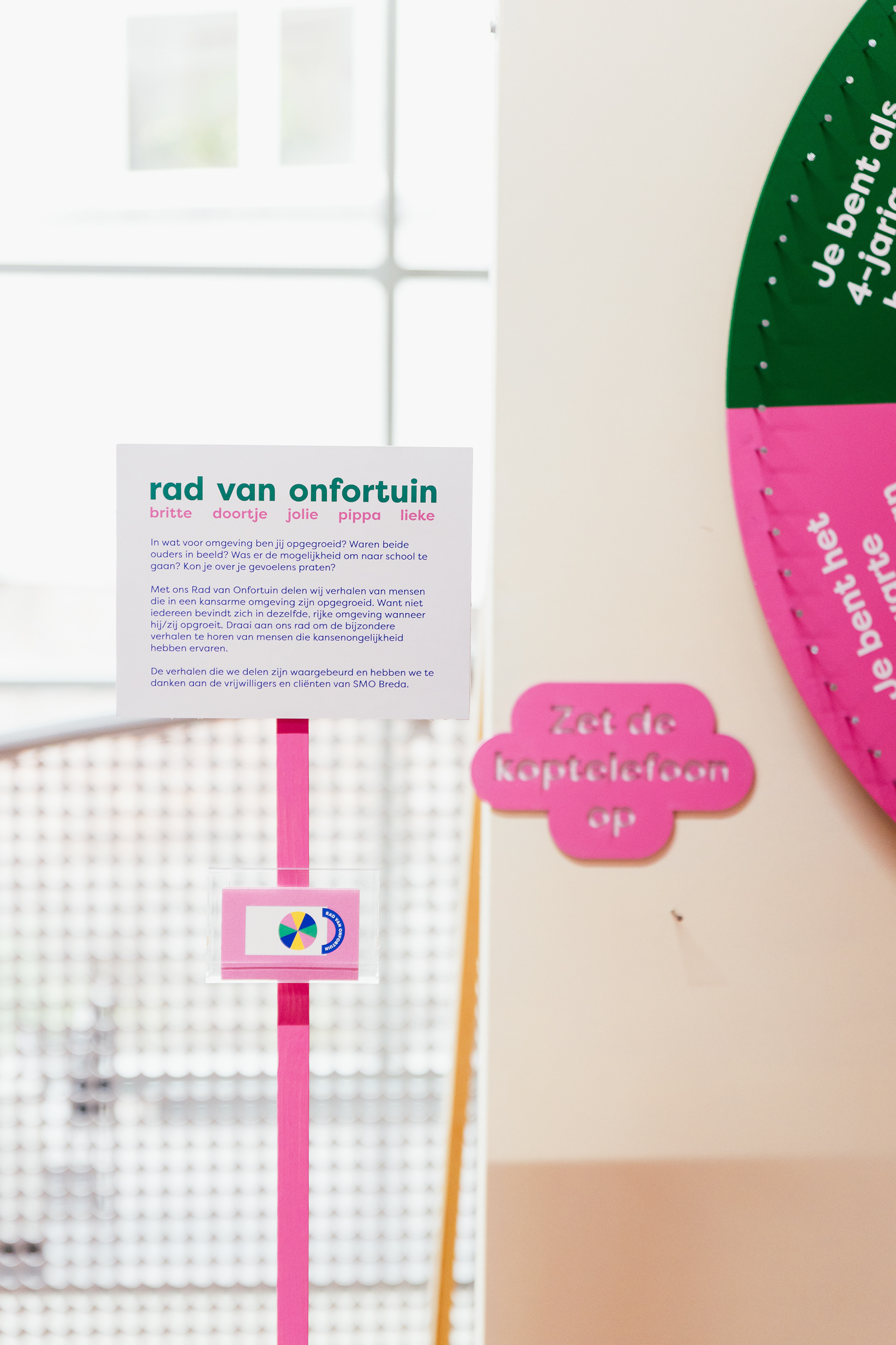 Het idee dat we in het begin hadden voor het concept was om de bezoeker een hokje in te laten lopen waar het rad te zien is en de tune van ‘Het Rad van Fortuin’ afspeelt zodra er aan het rad gedraaid wordt. Ook zouden daar dan flitsende lichten bij komen. Door deze elementen toe te voegen creëren we een soort kermissfeer of spelshow. Wanneer iemand dus aan het rad draait, wordt diegene op het verkeerde been gezet. Valt er iets te winnen? Gratis?! Maar als het rad stil komt te staan, kun je het verhaal lezen van iemand die in een kansarme omgeving is geboren/opgegroeid. Zo verandert de sfeer van een leuk spelletje spelen naar iets heel serieus.