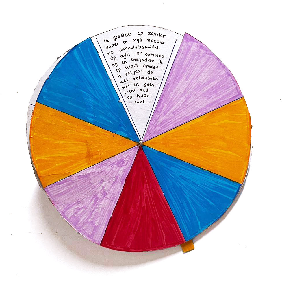 In ons onderzoek hebben we ons verdiept in kansenongelijkheid. Hierbij hebben we vooral de focus gelegd op de kloof tussen mensen met een hoge en een lage sociaal-economische positie . We zijn in gesprek gegaan met mensen die kansenongelijkheid hebben ervaren in hun jeugd. Het resultaat is het Rad van Onfortuin; een fysiek werk dat deze verhalen deelt met de rest van Breda. Het is een werk dat op de eerste blik speels overkomt, maar als je er meer aandacht aan besteedt een diepere betekenis krijgt.