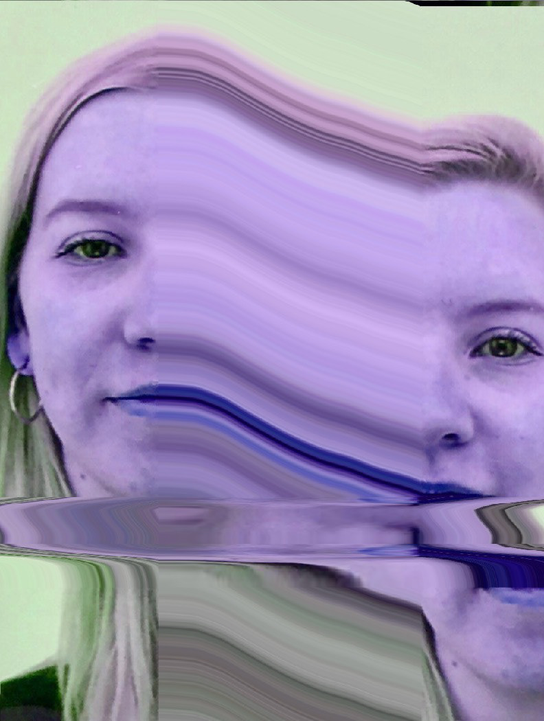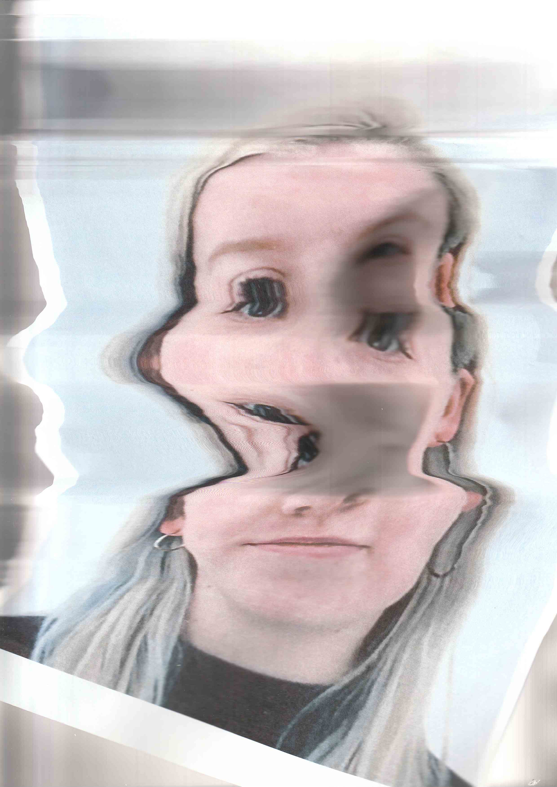 Met het thema glitch moesten we in de eerste les allemaal beelden maken met een foto van ons zelf met een glitch. Ik was op een gegeven moment aan het experimenteren met de foto’s te bewegen in de scanner. Dit effect heb ik we vaker gebruikt en vond ik zelf nog niet interessant genoeg, dus ben ik gaan kijken hoe ik daar een draai aan kon geven. Ik ben gaan kijken of ik dat effect ook analoog kon namaken. Dit heb ik gedaan door twee afbeeldingen in dunne repen te snijden en dit de hele tijd dubbel op te plakken. Dit vond ik een geslaagd experiment dus ben ik gaan kijken of ik dit in plaat van alleen in de lengte te doen ik dit ook in de breedte kon doen.
